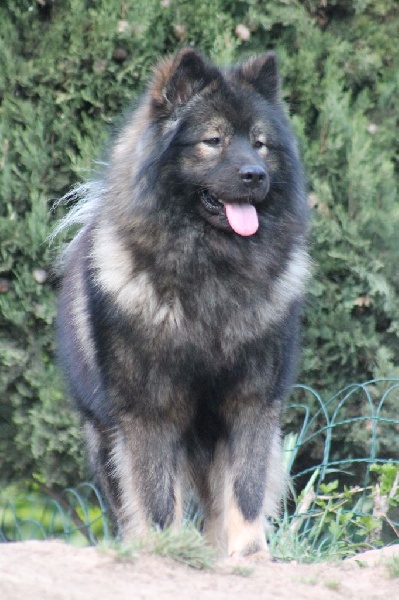 Denture correcte, exc type, tete et expression, bonne encolure, exc fourrure, poitrine bien éclatée exc ligne de dos et fouet, exc rapport de longueur de jambe, aplombs et angulations correctes, exc demarche belles allures
